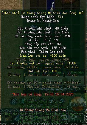 Vũ khí ngoại công sẽ + 10 điểm stvl và + 1 trấn phái